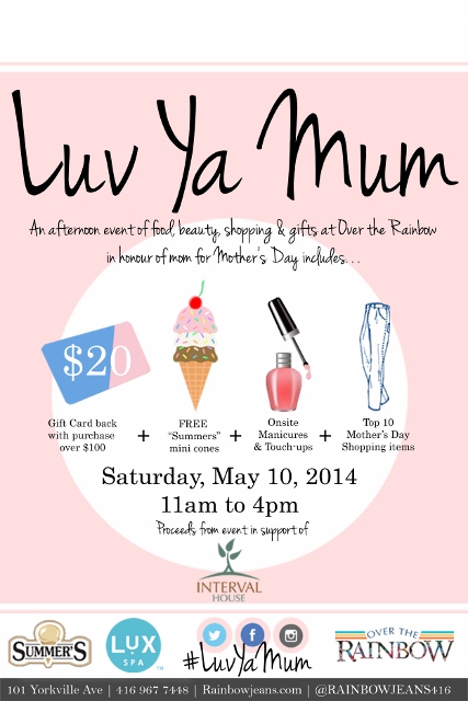 Over The Rainbow invites you for a day of shopping, treats and pampering this Mother’s Day. Enjoy free mini cones form Summers Ice cream and complimentary nail polish changes from LUX-SPA. Purchases made during the event will raise funds for The Interval House.